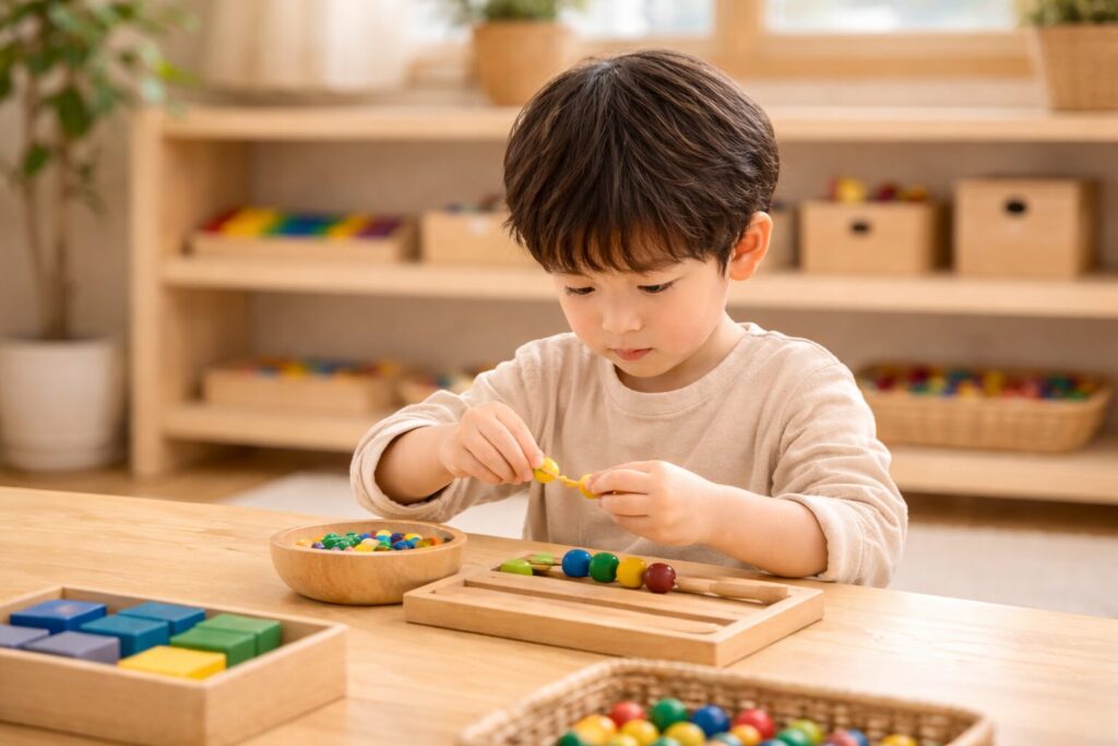 モンテッソーリ教具は「自己訂正」ができる設計になっており、子ども自身が間違いに気づけるよう工夫されています。